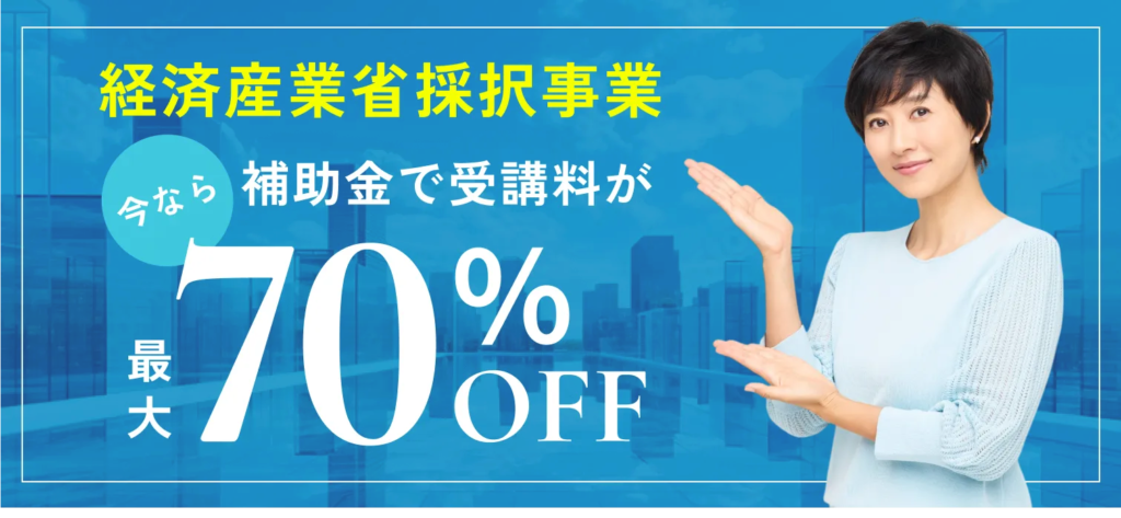 割引制度はないが、転職コースは補助金受給の対象だ。 (2025年6月時点)転職コースの受講料金は税別598,000円だが、最大418,600円の補助金を受給すれば、実質の受講料は税別179,400円になる。 分割払いで無理なく受講することも可能だが、それでも高いと感じるならキャリアコーチングを受けながら転職活動が行える「リクルートエージェント」「doda」「ビズリーチ(一部有料)」といった転職エージェントの利用もおすすめしたい。