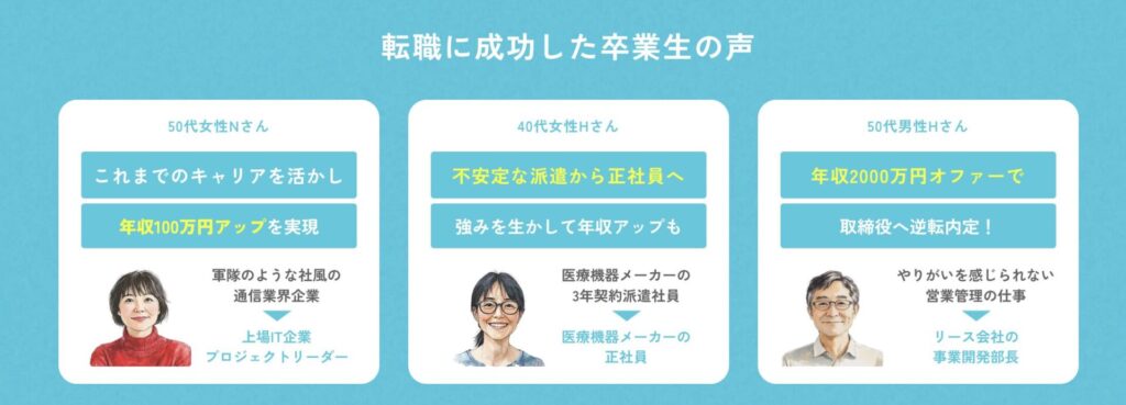 また、強みを武器に変える方法までを学べるため、受講期間で希望する転職の実現が可能だ。