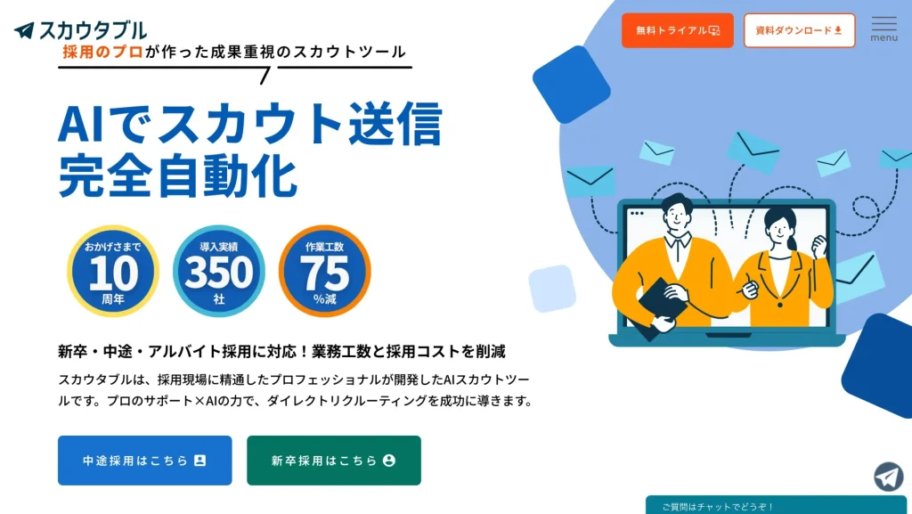 「スカウタブル」は、新卒・中途採用の両方に対応しダイレクトリクルーティング業務を完全自動化するAIツールです。